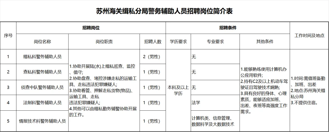 苏州海关缉私分局因工作需要,现面向社会公开招聘缉私警务辅助人员6名,有关事项公告如下: