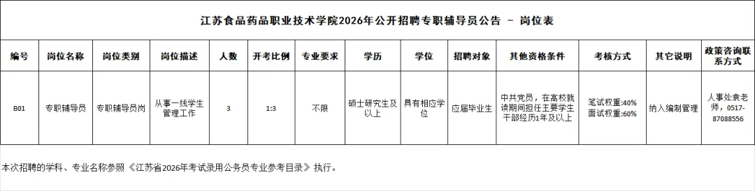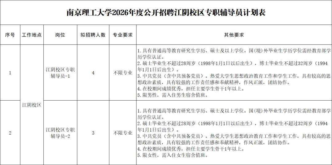 5.满足应聘岗位其他要求,详见《南京理工大学2026年度公开招聘江阴校区专职辅导员计划表》。