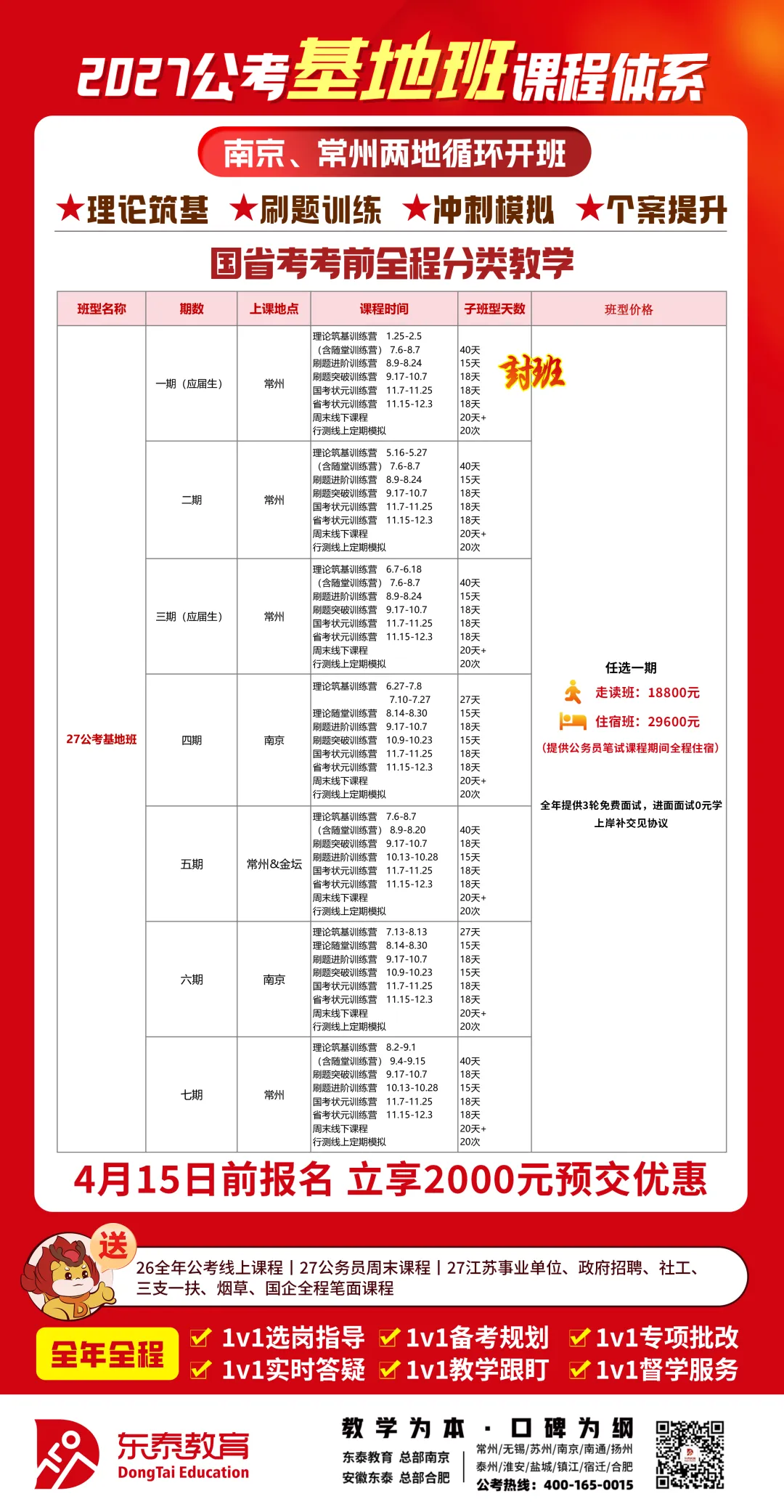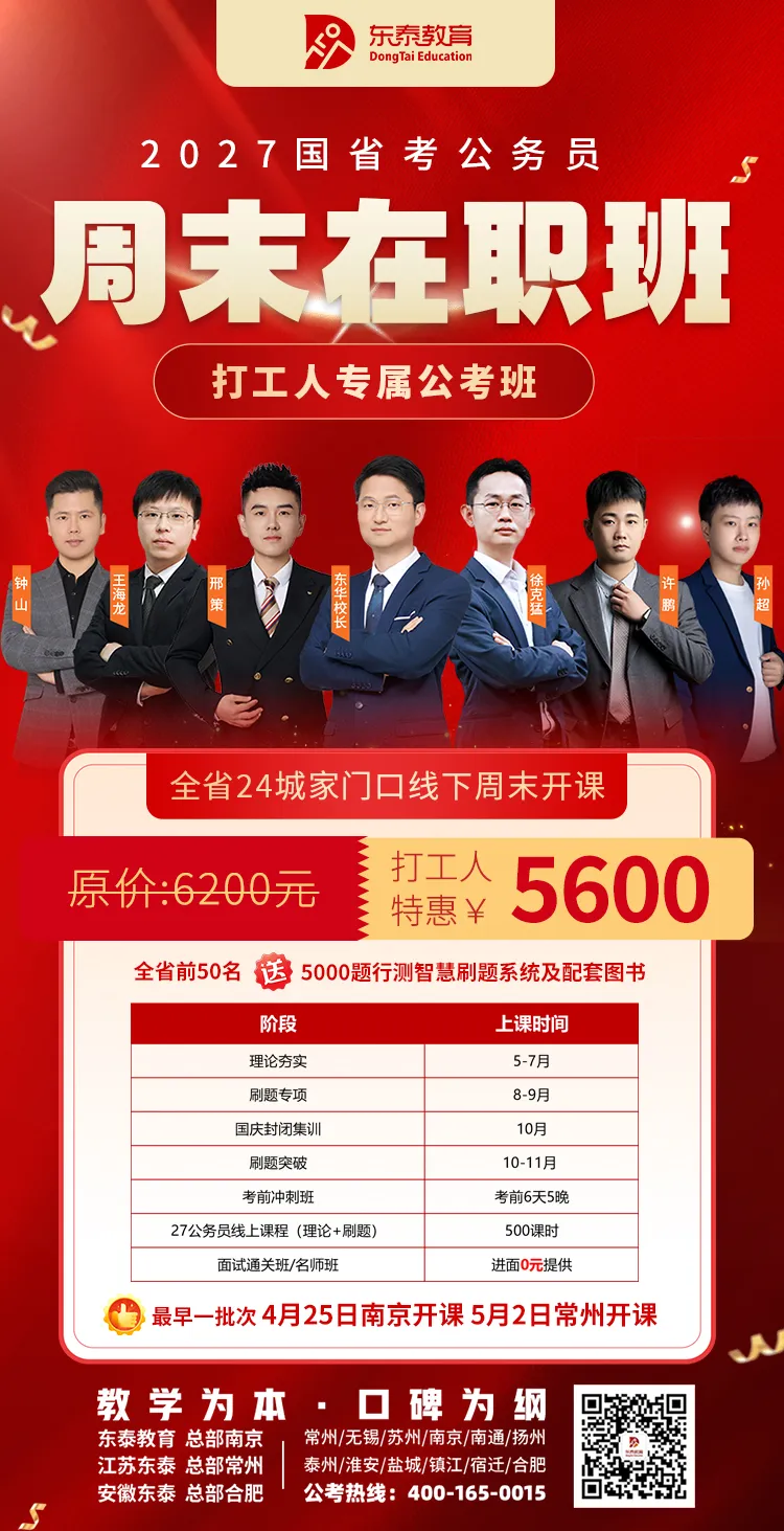 针对社会在职的全程班(一年无限学)、国省考全程班、周末班;针对单科突破的中秋国庆班、考前状元训练营;以及东泰特色的公考夫妻班、上岸无限学班等。