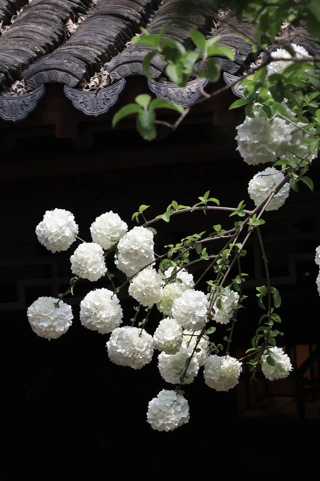 一朵朵纯粹的雪白色,一开就是一整棵树,远看像一团团白云,落在了青瓦白墙上。