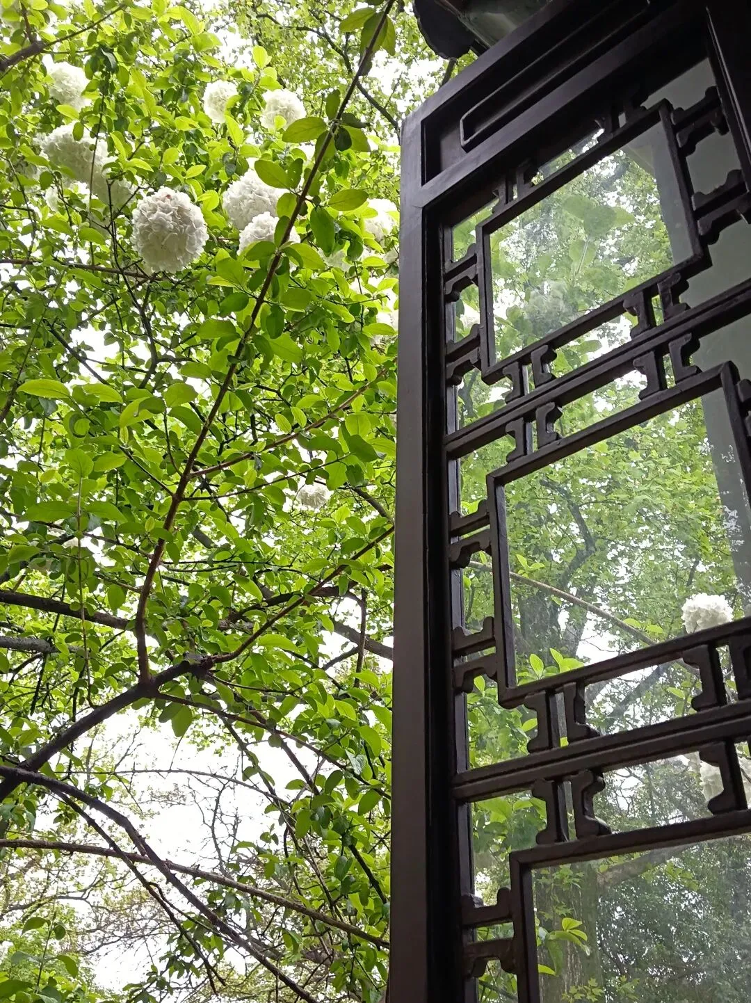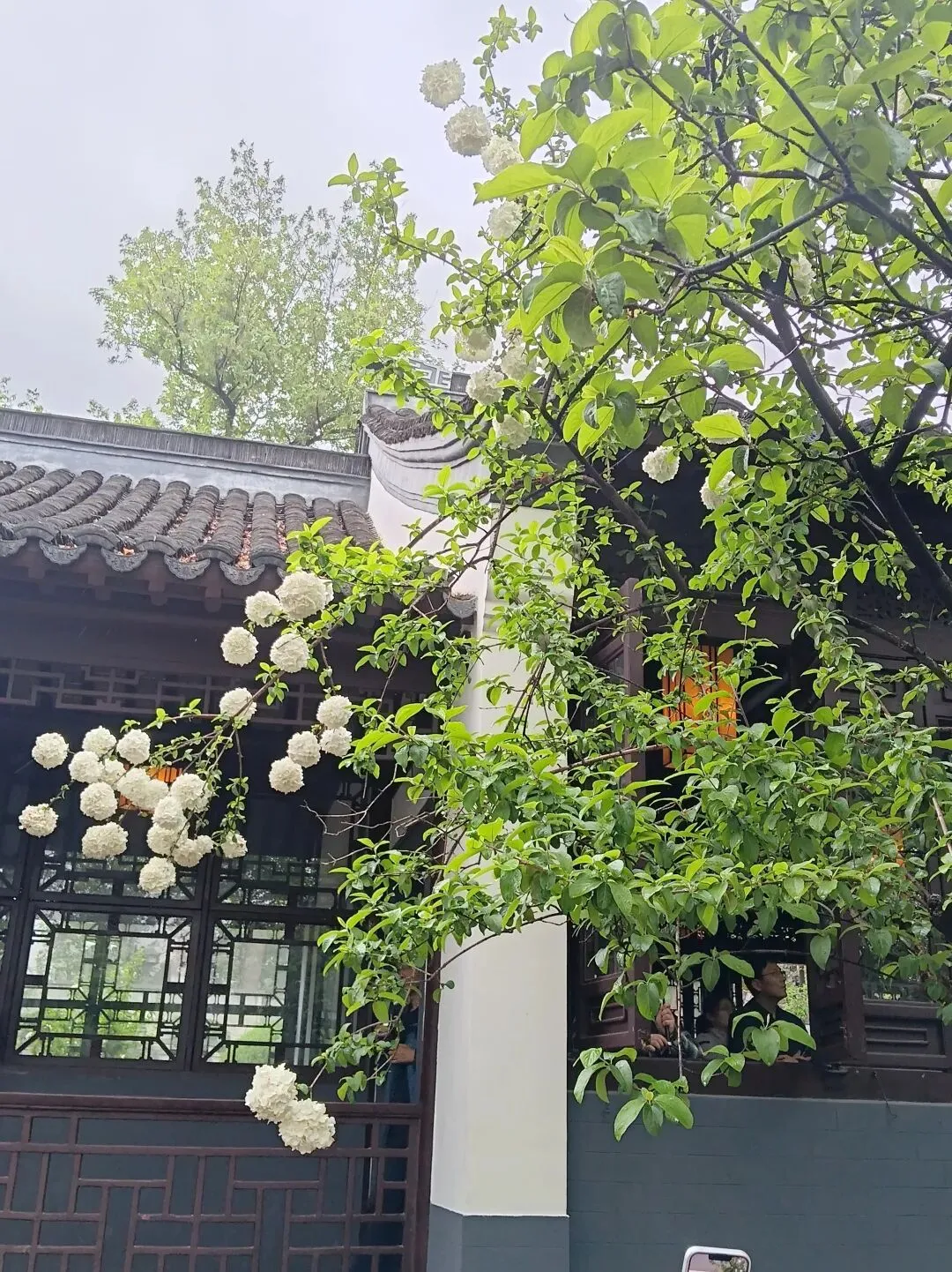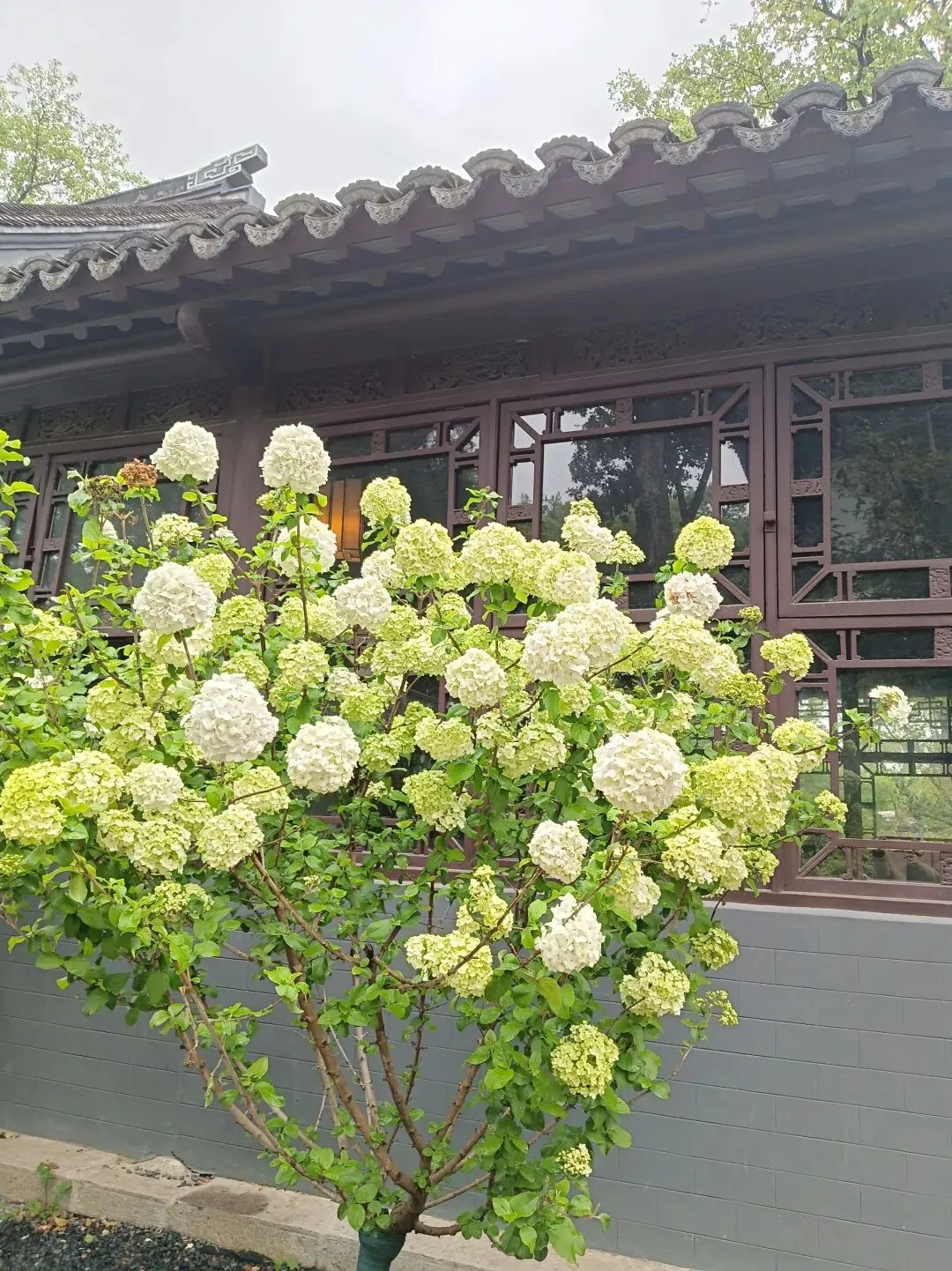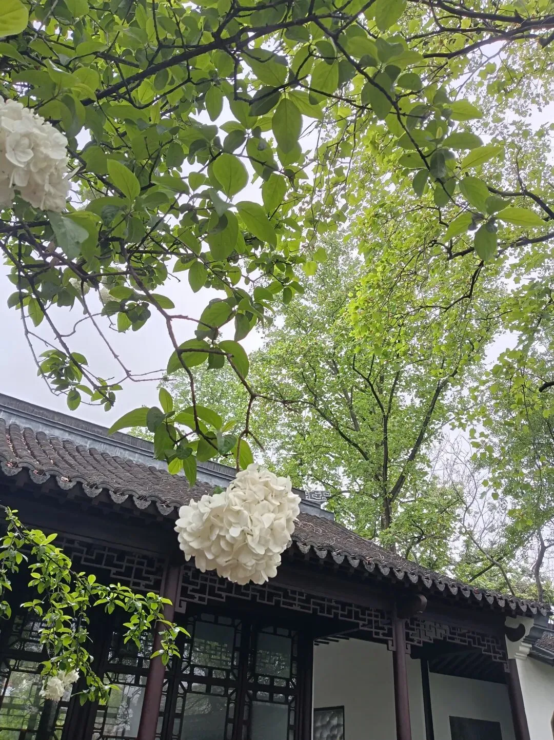 我站在树下看了很久。雾蒙蒙雨水打在花瓣上,花朵微微颤动,像是在点头。背后的书院是古色古香的建筑,青瓦、白墙、木窗棂,和绣球花的素雅相得益彰。