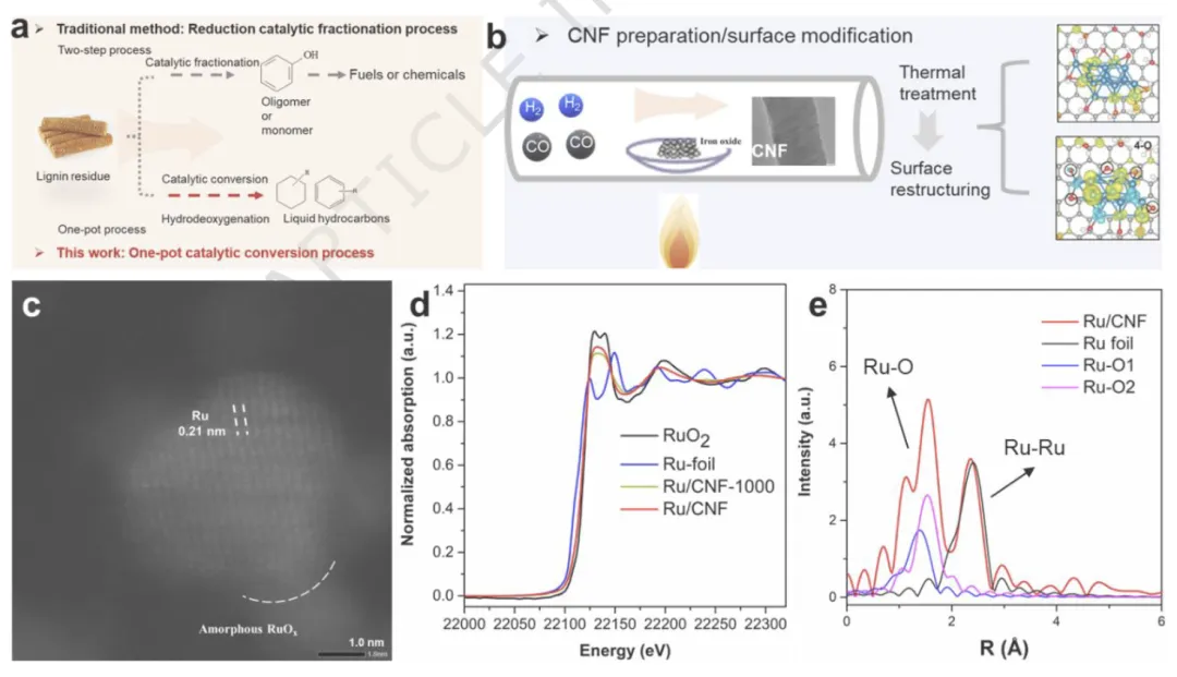 (a) 木质素转化的传统方法与本研究方法的比较,(b) 本工作中用于合成碳纳米纤维的方法,(c) Ru/CNF催化剂的HAADF-STEM图像,(d) Ru/CNF催化剂和参照物的Ru K-edge XANES谱图,(e) Ru/CNF、Ru箔和RuO₂的Ru K-edge FT-EXAFS谱图。