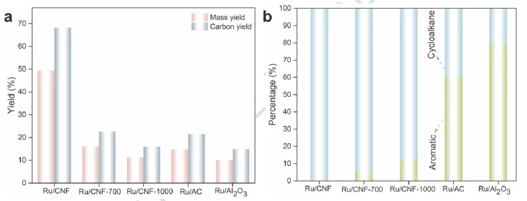 小结:Ru/CNF:质量收率 49.1%,碳收率 67.7%,产物100% 环烷烃,无芳烃。高温热处理(700/1000 ℃)脱除含氧基团后:收率大幅下降,产物出现芳烃。对比样 Ru/AC、Ru/Al₂O₃:主产物为芳烃,收率远低于 Ru/CNF