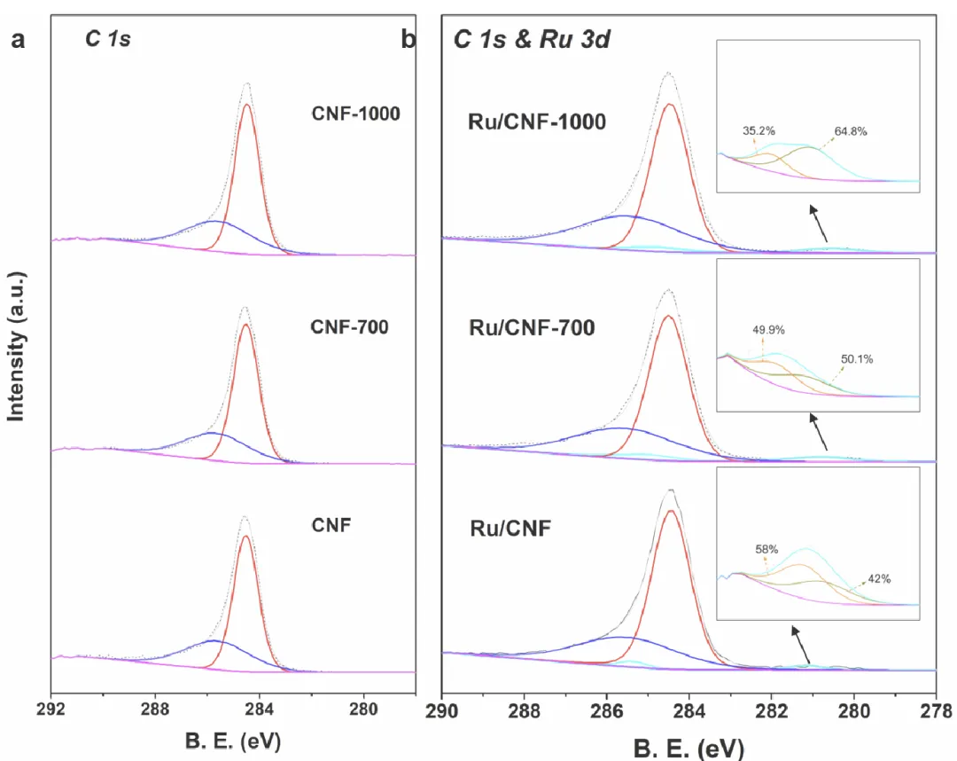 小结:Ru 3d 出现两组峰:~280.1 eV(金属 Ru)、~280.6 eV(氧化 Ru);RuOx 比例:Ru/CNF(58%) > Ru/CNF-700(49.9%) > Ru/CNF-1000(35.2%);高温脱除表面氧 → RuOx 比例下降,金属 Ru 比例上升