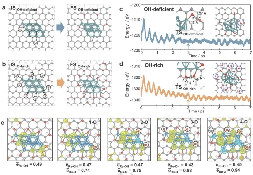 小结:表面 OH 可迁移到 Ru 上,2OH → O + H₂O***,H₂O 脱附留下界面 O*;O * 强吸电子,使 Ru 形成Ruδ++・・・Ruδ+・・・Oδ−极化界面;Ru/CNF 的 Ru–O 键长更短(1.706 Å),相互作用更强;能量曲线快速稳定,表明Ru/RuOx 界面结构热力学稳定