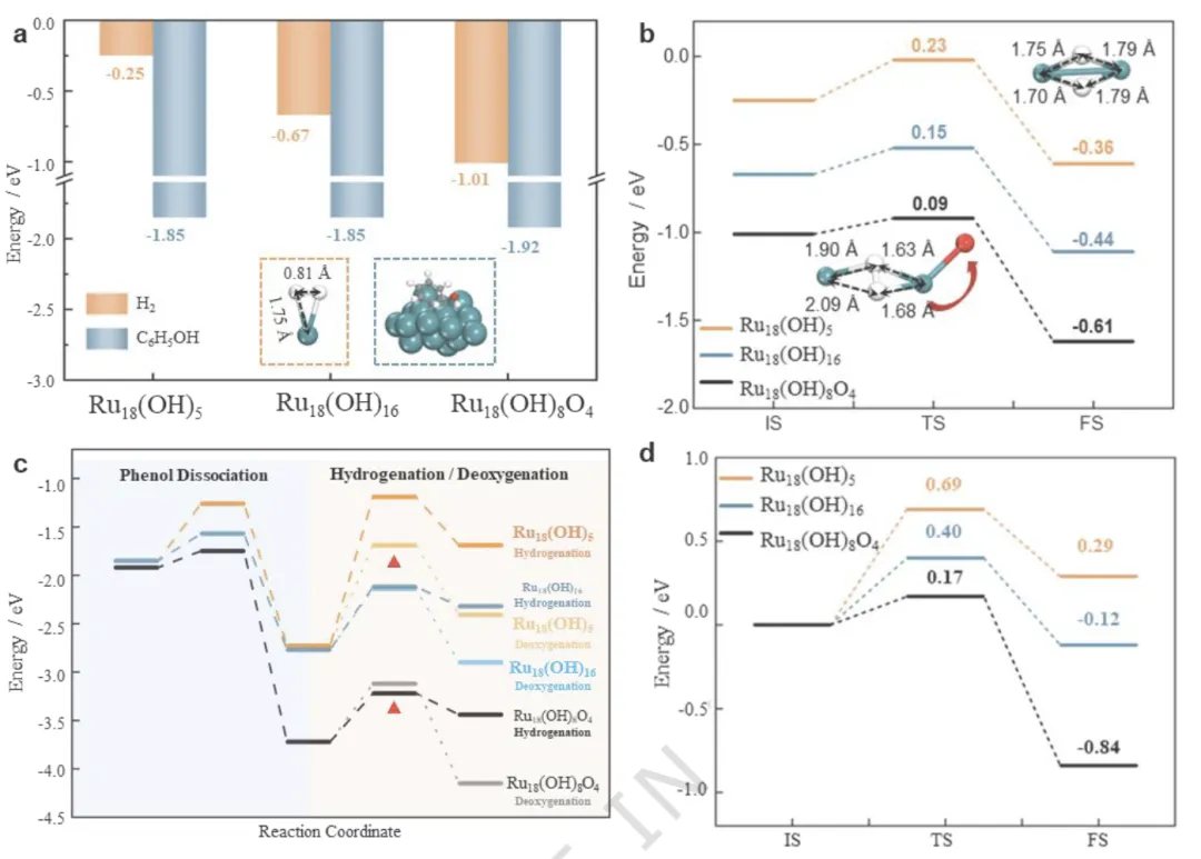 (a) H₂和苯酚在Ru₁₈(OH)₅(OH缺乏)、Ru₁₈(OH)₁₆(OH丰富)和Ru₁₈(OH)₈O₄(O修饰)模型上的吸附能。插图显示了H₂和苯酚的吸附构型,键长以黑色标示。(b) H₂解离反应的能垒分布图,插图显示过渡态结构。过渡态时的H-H键长以黑色标示。(c) 苯酚解离及随后的加氢或脱氧过程的能垒分布图。红色三角形表示优先反应路径。插图展示了脱氧反应的过渡态构型。(d) 环己醇脱氧反应的能垒分布图。插图描绘了过渡态构型。绿色:Ru;灰色:C;红色:O;白色:H。