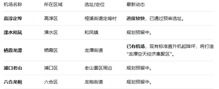 根据官方批复的《南京市国土空间综合交通规划(2021—2035年)》,南京正式明确了 “一主一辅、五个通用机场” 的宏伟蓝图。