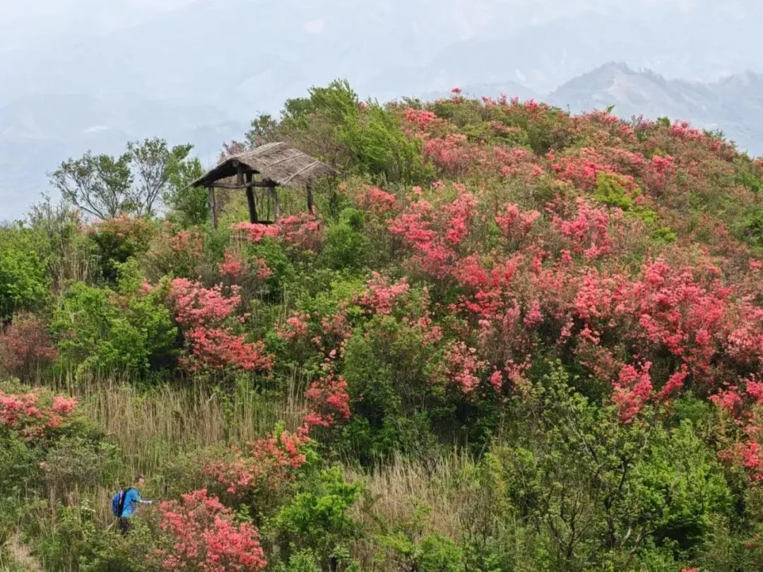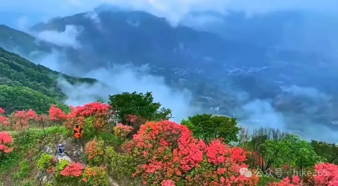 汤公山位于安徽与浙江的交界处,座落在安徽宁国千秋村畲族乡,是千秋关的最高山峰。海拔约1269米,山体高大,悬崖峭壁、怪石嶙峋。这片山巅之上天然生长的大片高山杜鹃,每年四月开始,杜鹃花持续开放一个多月,远远望去犹如一个巨大的花环戴在汤公山上。汤公山赏花环线全程约8km,爬升800m,耗时约5小时。