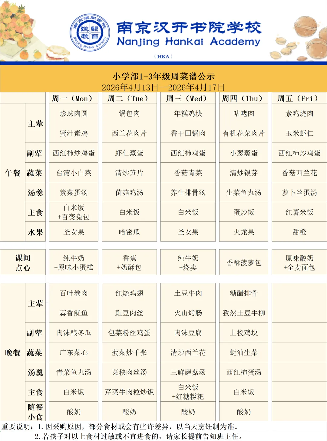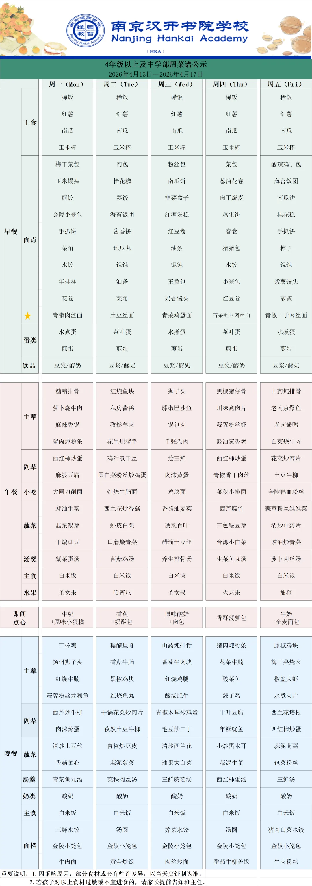 >【Hi,开开!】南京汉开周菜谱(4.13-4.17)
