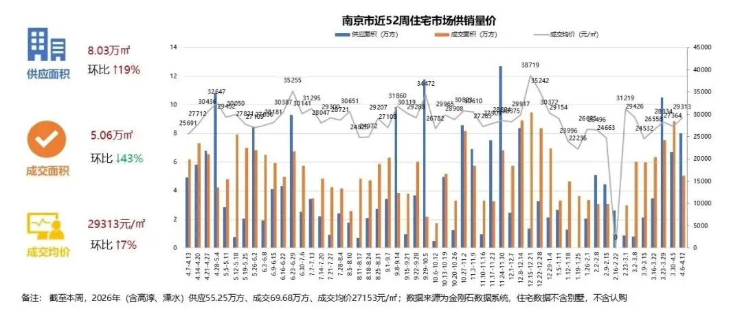 本周住宅市场供应8.03万㎡,环比上涨19%,成交5.06万㎡,环比下降43%,成交均价29313元/㎡,环比上涨7%。