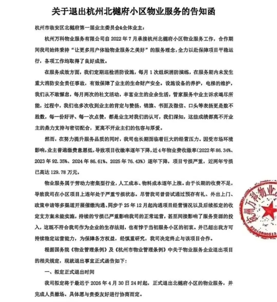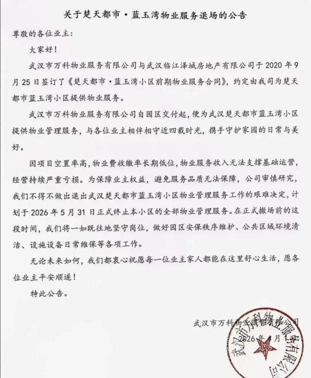 据公开报道,杭州万科物业因某小区近两年累计亏损逾百万元,拟于2026年4月30日退出;武汉万科物业也因项目空置率高、收缴率长期低位,宣布于5月31日退出当地某小区。