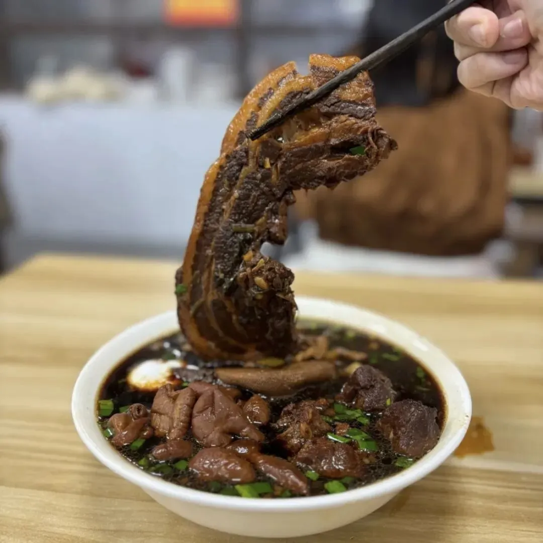 招牌大肉面里的五花肉比碗还长,在老卤中修炼多时,瘦肉紧实柔嫩,肥脂入口即化。面条每一根都吸饱了咸甜交织的卤汁,再淋一勺辣油,五脏庙瞬间妥帖。
