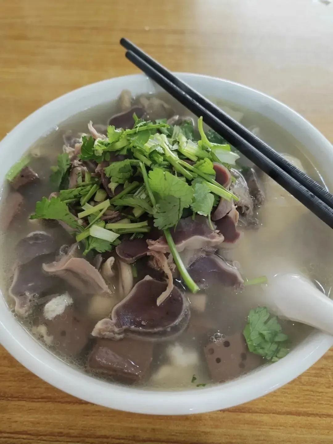 鸭架久熬的汤底鲜美不油不腥,鸭血嫩滑、鸭肠爽脆、鸭肝软糯,粉丝软硬刚好,满满一碗全是料。