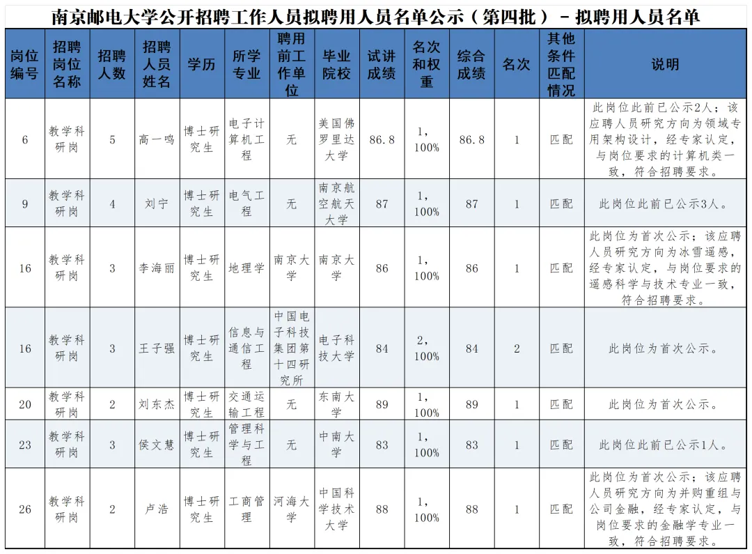 南京邮电大学公开招聘工作人员拟聘用人员名单公示(第四批)