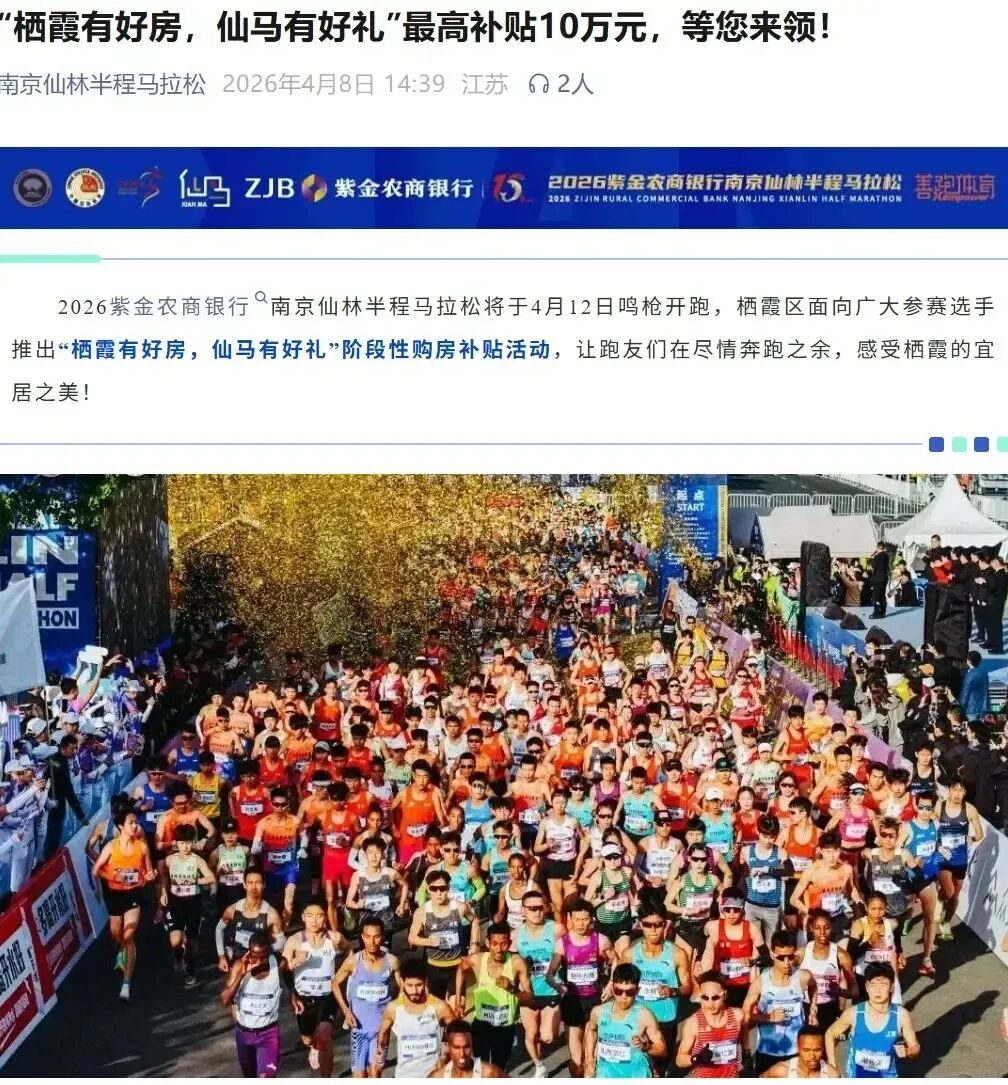 南京仙林马拉松,创办于2017年,首届即获评中国田协“铜牌赛事”,五年时间已升级为国内金牌赛事。仙马已成为南京最具影响力的世界田联精英标牌赛事,以青春、高校、生态、PB赛道为核心标签。2026年4月7日,南京栖霞区官方微信公众号 “南京栖霞发布” 发布《“栖霞有好房 仙马有好礼” 专属购房补贴政策问答》,明确针对2026南京仙林半程马拉松参赛选手推出购房补贴优惠:报名选手补贴2万元,参赛选手补贴6万元,完赛选手补贴10万元,三档不重复享受,按最高一档标准兑现。