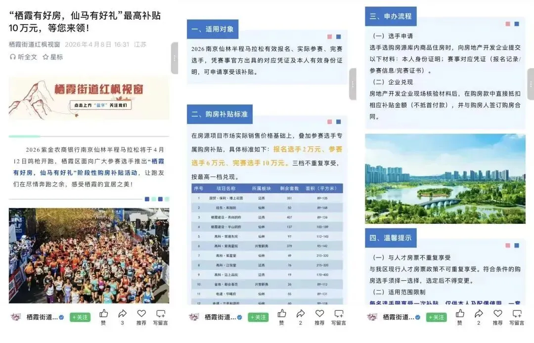 享有购房补贴者在规定时间完成购房合同网签备案,超过这个日期补贴将会失效。“选手选购房源库内商品住房时,要向房地产开发企业提交本人身份证明和赛事对应凭证,后续房地产开发企业现场核验材料后,在购房款中直接抵扣相应补贴金额,这部分可以跟他们再详细咨询。”工作人员介绍。推送“消失”:共14家楼盘参与活动 网友质疑政策有“套路”?然而4月8日晚间,“南京栖霞发布” 该篇推送被删除,页面显示 “根据作者隐私设置,无法查看”,一时间引发不少网友猜测。此后,南京仙林半程马拉松、我的栖霞微信公众号等官方平台原先的推文均已“消失”。针对推送删除一事,4 月9日,上游新闻等媒体致电南京市栖霞区住房和建设局,工作人员明确证实政策真实性:“针对这次仙林半马,报名、参赛或完赛的选手,凭相应证明即可申请购房补贴。完赛选手确实能获得10万元补贴,活动是真实的,由区政府组织。”