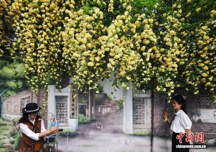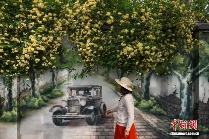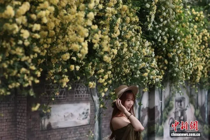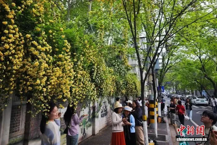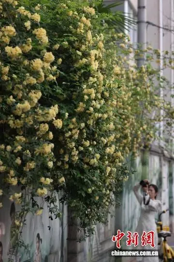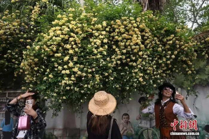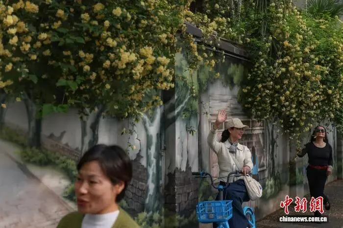 4月10日,江苏南京,市民在碑亭巷盛开的木香花前拍摄照片。近日,这里如瀑布般的木香花盛开,与讲述当地过往市井生活的百米墙绘“碑亭印记”相得益彰。中新社记者 泱波 摄