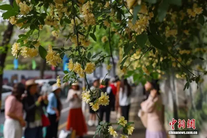 4月10日,江苏南京,市民在碑亭巷盛开的木香花前拍摄照片。中新社记者 泱波 摄