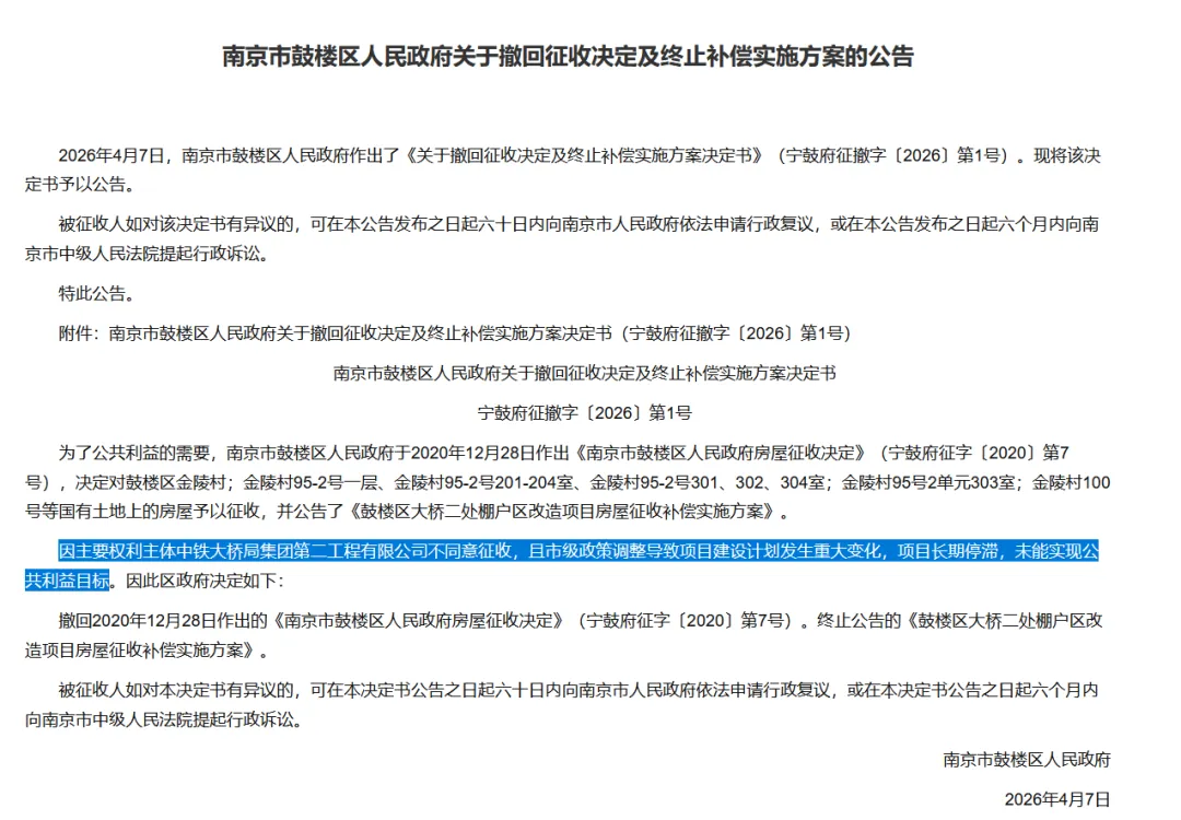 前不久,鼓楼区人民政府官方刊登了一则关于《南京市鼓楼区人民政府关于撤回征收决定及终止补偿实施方案的公告》。