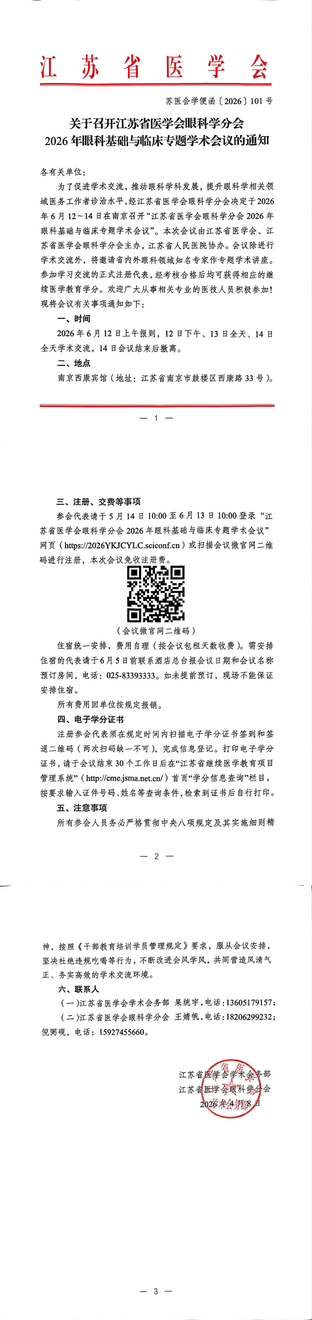 为了促进学术交流,推动眼科学科发展,提升眼科学相关领域医务工作者诊治水平,经江苏省医学会眼科学分会决定于2026年6月12~14日在南京召开“江苏省医学会眼科学分会2026年眼科基础与临床专题学术会议”。本次会议由江苏省医学会、江苏省医学会眼科学分会主办,江苏省人民医院(南京医科大学第一附属医院、江苏省妇幼保健院)协办。会议除进行学术交流外,将邀请省内外眼科领域知名专家作专题学术讲座。参加学习交流的正式注册代表,经考核合格后均可获得相应的继续医学教育学分。欢迎广大从事相关专业的医务人员积极参加!