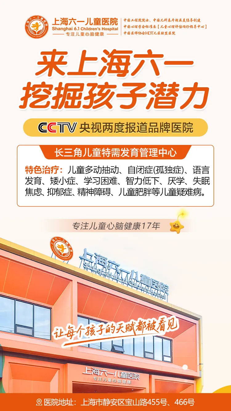 上海六一儿童医院是长三角儿童特需发育管理中心,专注儿童心脑健康17年,由中国工程院院士、中国儿科泰斗胡亚美倡导创建,累计150多位京沪名医领衔助力,23种《儿童心理障碍防治丛书》在全国发行,2013年和2016年两度获CCTV央视报道,在我国中西医诊治儿童疑难病领域享有盛名。医院在国内创新形成了“N+1心脑同治康复体系”,为我国广大疑难病患儿提供“六一方案”。