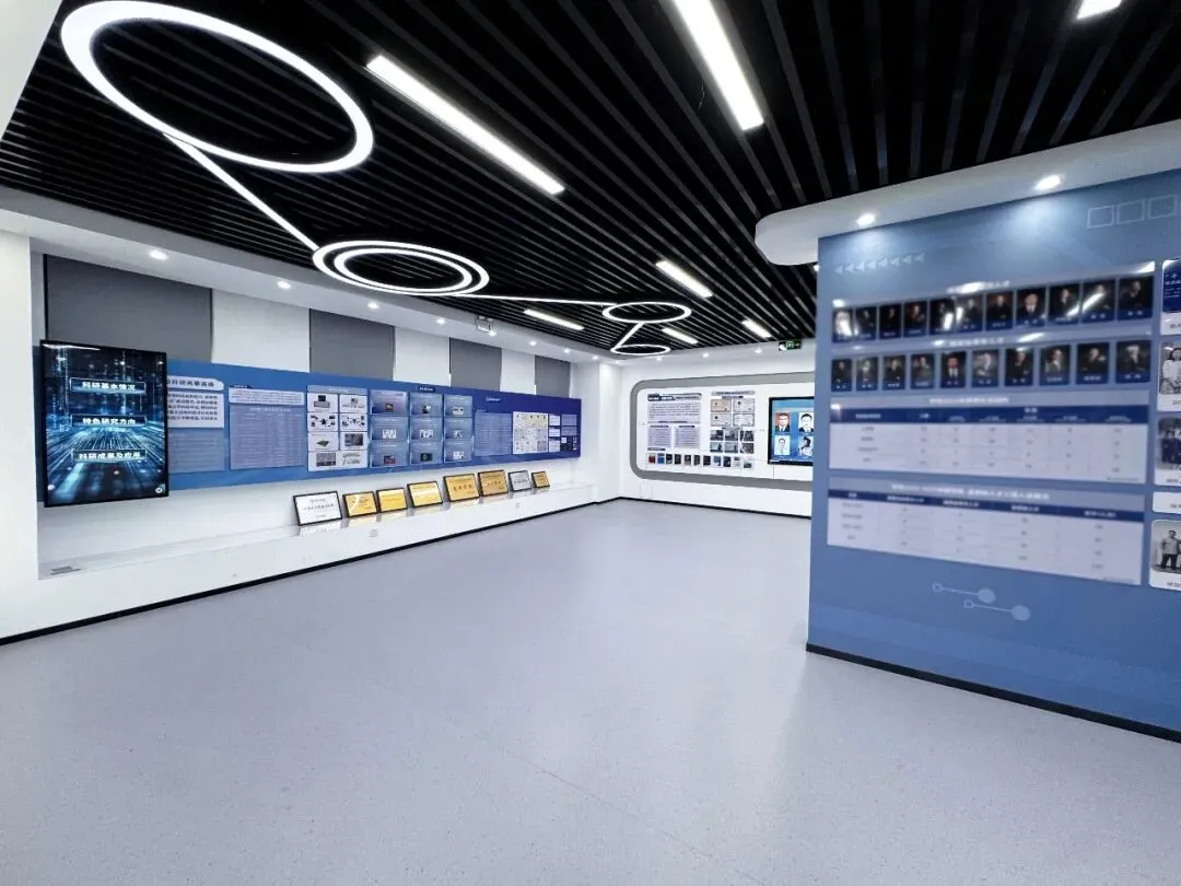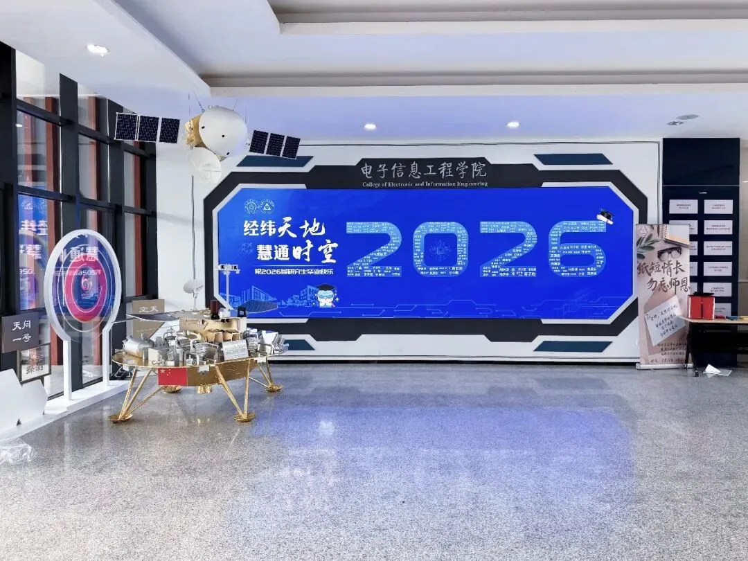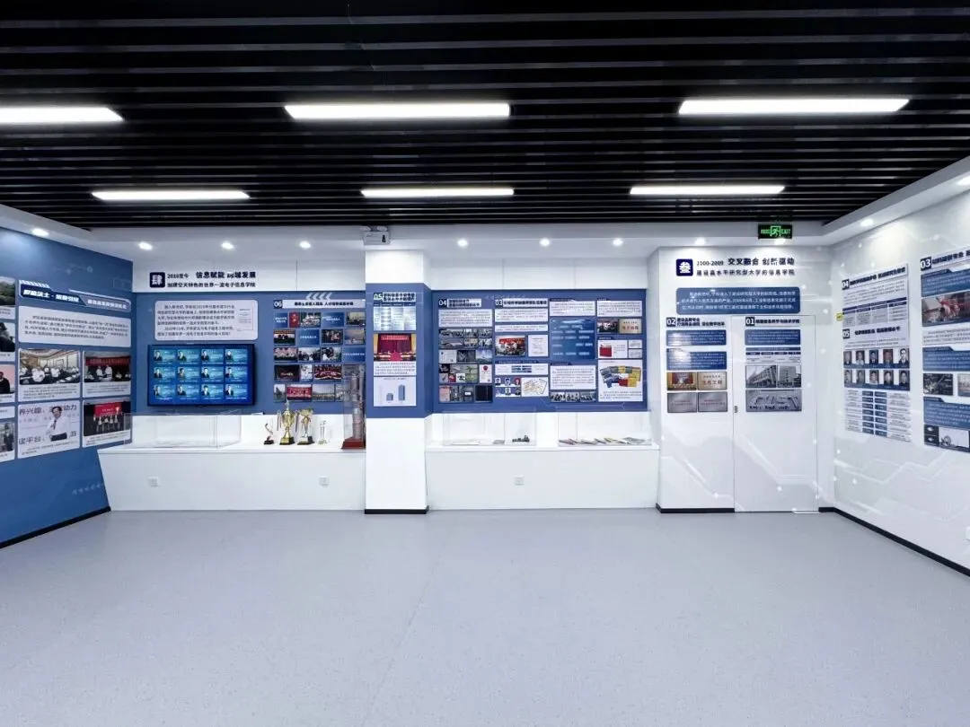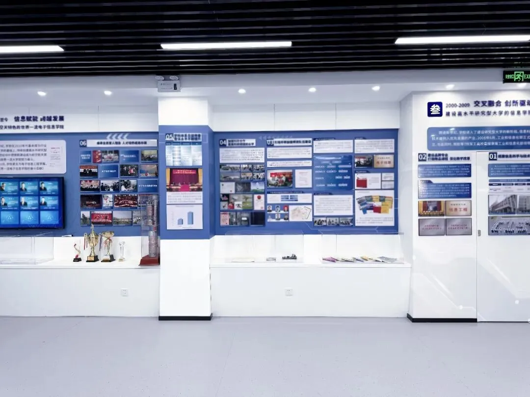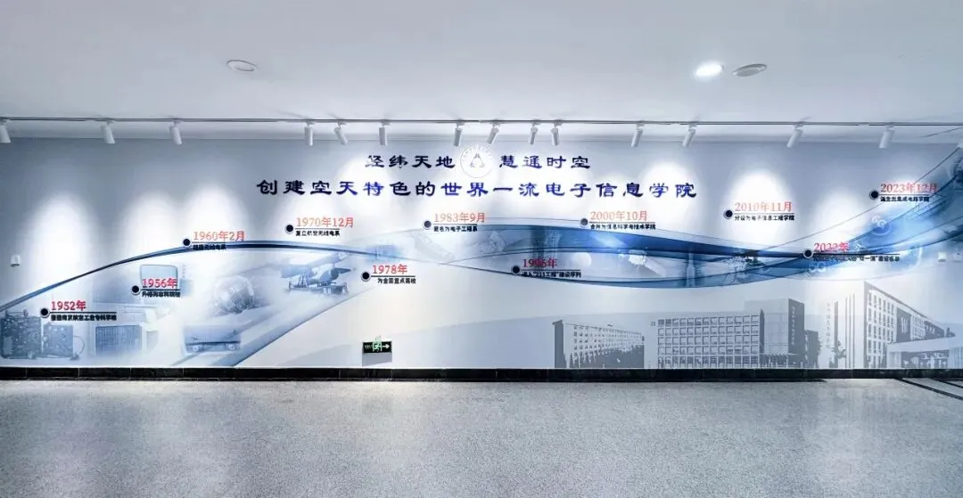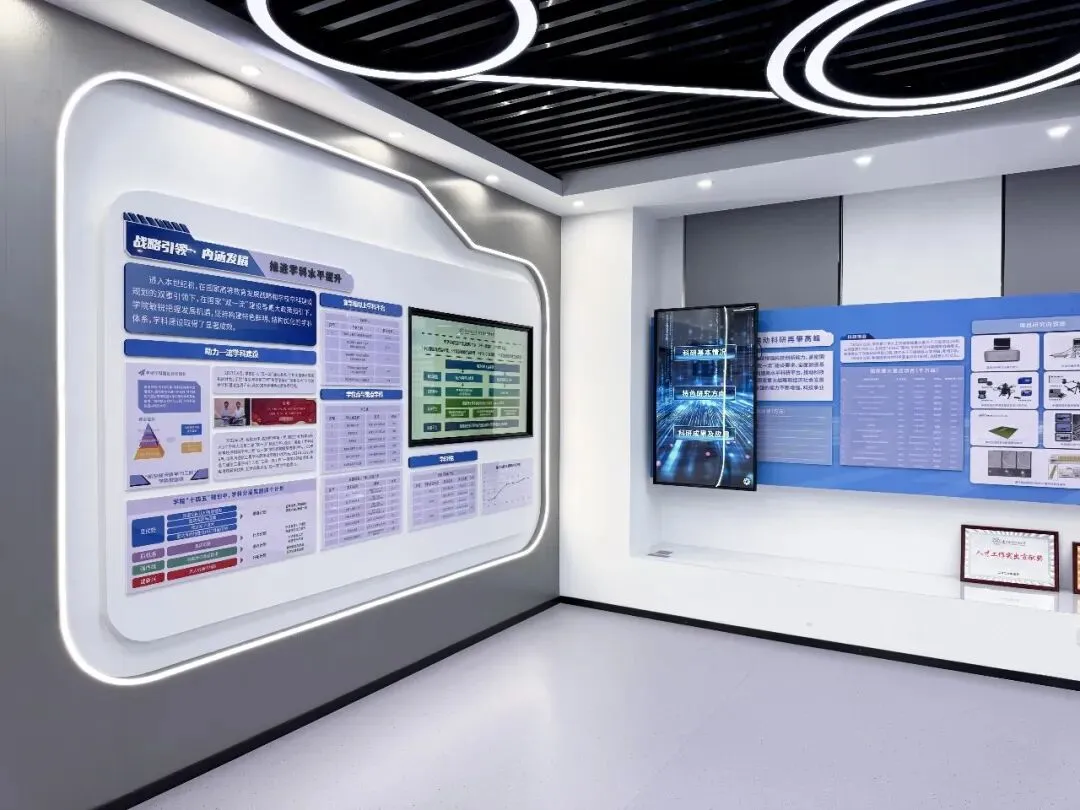 将电子信息、航天航空的科技元素与学院发展脉络深度融合,打造出一个有故事、有技术、有气场的现代展示空间。
