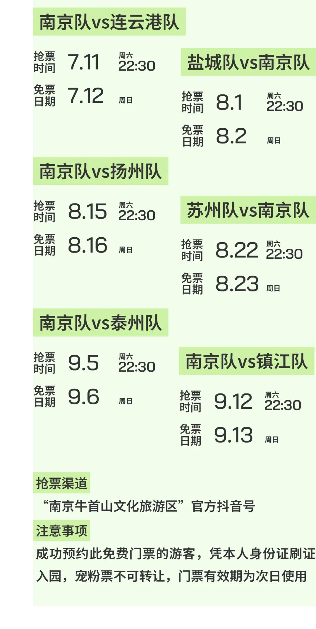 举个例子:4月18日(周六)宿迁VS南京,成功预约本场比赛的市民,4月18日至5月17日,可半价游览牛首山景区。