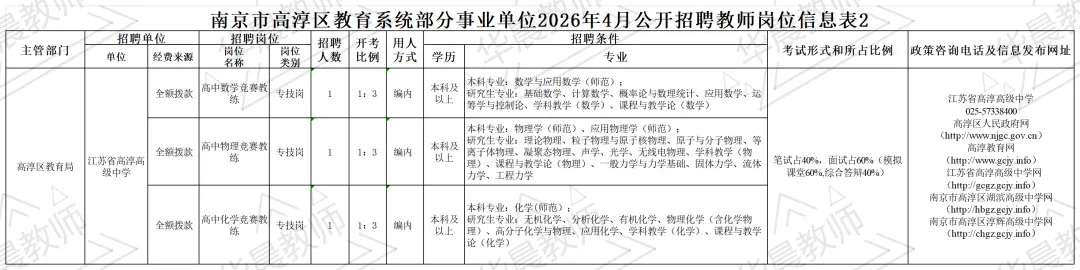 本次招聘相关信息在高淳区人民政府网(http://www.njgc.gov.cn)、高淳教育网(http://www.gcjy.info)、江苏省高淳高级中学网(http://gcgz.gcjy.info)、南京市高淳区湖滨高级中学网(http://hbgz.gcjy.info)、南京市高淳区淳辉高级中学网(http://chgz.gcjy.info)等网站发布。具体的招聘岗位、数量、资格条件等详见附件:《南京市高淳区教育系统部分事业单位2026年4月公开招聘教师岗位信息表1》及《南京市高淳区教育系统部分事业单位2026年4月公开招聘教师岗位信息表2》,以下简称《岗位信息表1》及《岗位信息表2》。