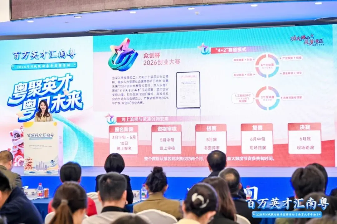 宣讲会上,佛山人社部门逐条解读创业扶持政策,全方位推介2026年广东“众创杯”赛事亮点、参赛方法与配套支持,同步在南京大学举办专项宣介会,精准对接青年创业资源。