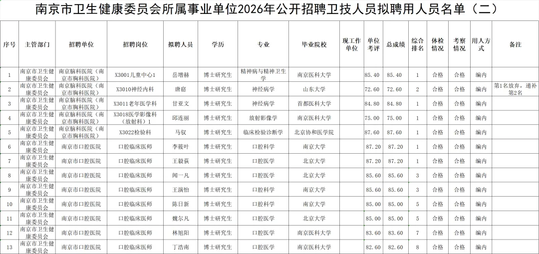 附件:南京市卫生健康委员会所属事业单位2026年公开招聘拟聘人员名单公示(二)