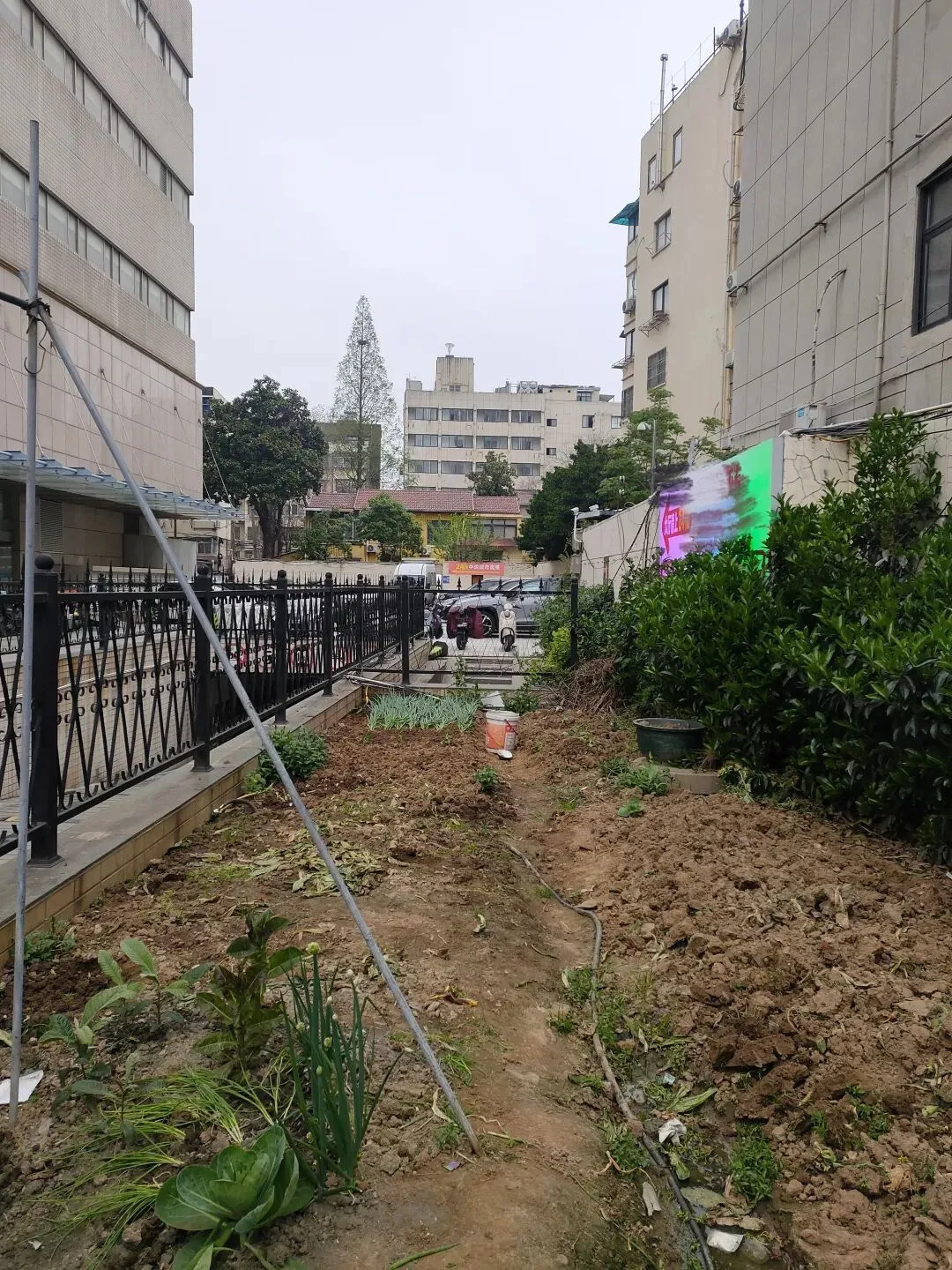 这是城市中心闹市区域中存在的一块小小的菜地,不知道这块菜地在这里存在了多长时间,因为这块菜地在管理人精心的照料下刚刚收获了一茬绿色、 环保 、有机的蔬菜,又在计划准备下↓一个季节的种植计划,这时还可以看见一些采摘后遗留的无用菜叶散落在菜地里,菜地中大部分板结的土壤,已经被重新翻起松动,黄色的土壤散发着生机勃勃的气息 ,它在等待平整后新种植的一些应季的蔬菜。