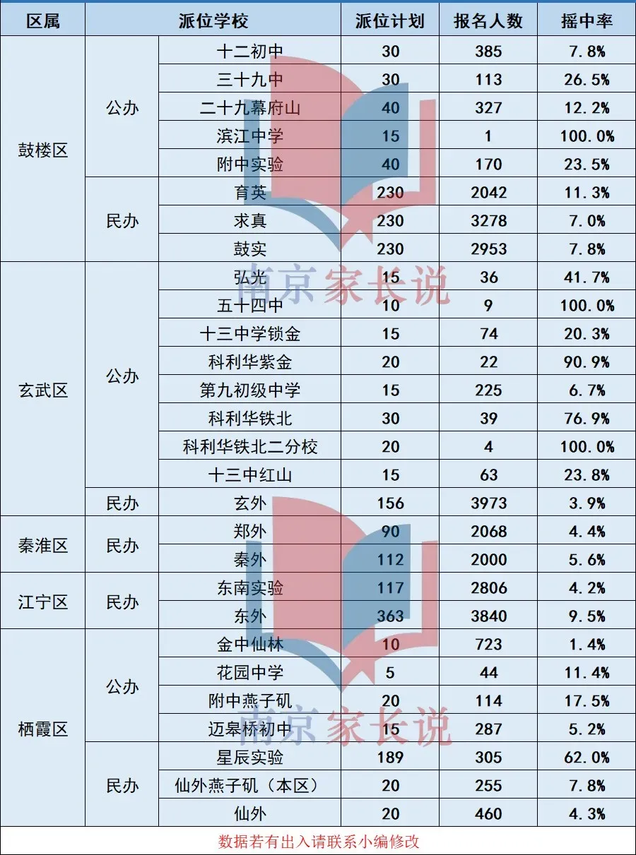 在摇号名额普遍扩招的情况下,热门校摇号中签率基本上维持在个位数,玄外3.93%、金陵河西6.82%、求真7.02%、鼓实7.79%、秦外5.6%......