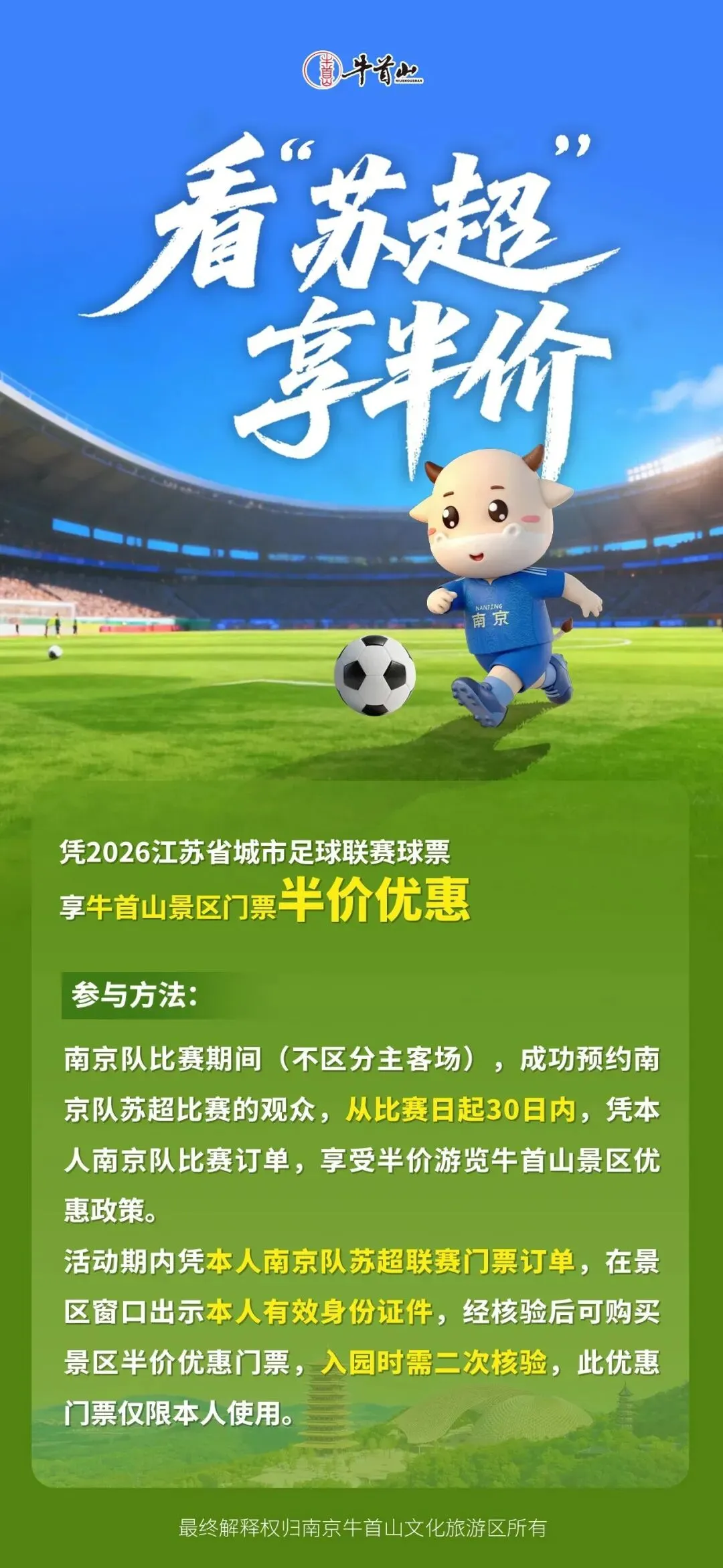 🔥2026年苏超联赛牛首山宠粉活动又来啦~今年同样是两类活动,一类是南京队进球送免费票,一类是球迷凭票半价~