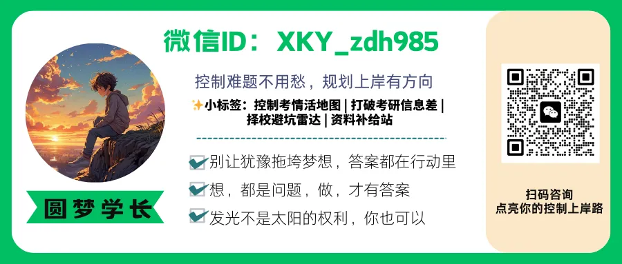 或许你目前还没有确定报考院校,这完全不必过于担心。在这个阶段,对控制专业知识展开全面且系统的学习才是重中之重。扎实、系统地掌握控制专业知识,不仅能够助力你从容应对后期可能出现的院校变动,让你比他人拥有更多的选择机会,还能为你日后研究生阶段的深入学习筑牢根基。PS:当然,我们班课的换校体系,可以完美解决还没确定院校但是想早早复习这一问题哦,了解详情+学长:XKY_zdh985