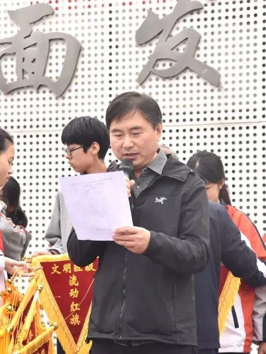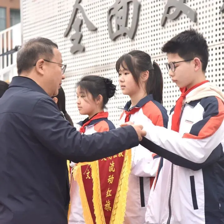晨会尾声,周跃林副校长宣读3月文明班级名单,校党总支王存贵书记为获奖班级颁奖。