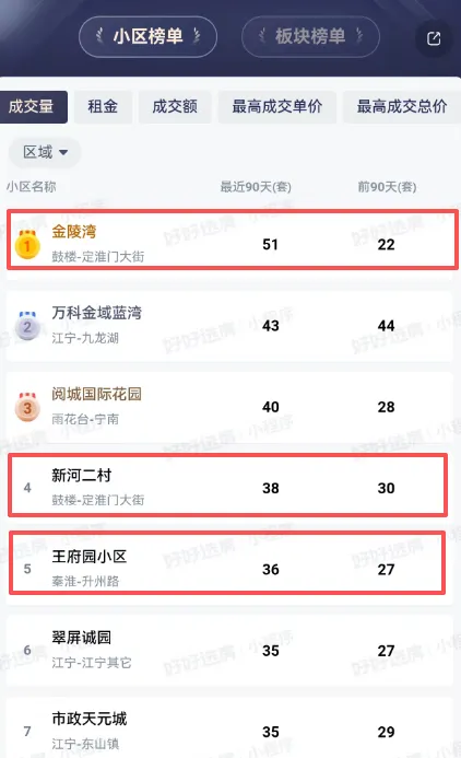 南师附中树人学校本部加持的恒盛金陵湾、新河二村,钟英中学加持的王府园小区,成交量遥遥领先,稳居南京二手房小区成交榜前五。