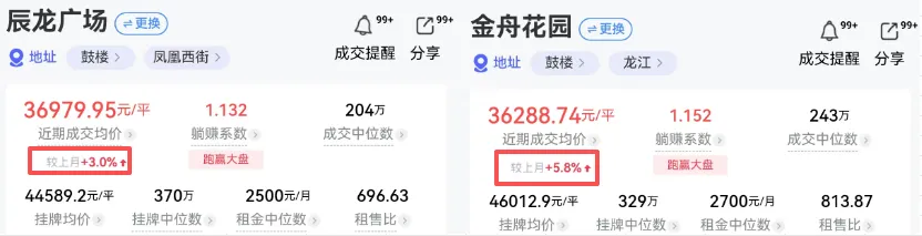 “银小+汇文”加持的辰龙广场,近期成交价较上月上涨约3%;金舟花园近期成交价上涨约5.8%;