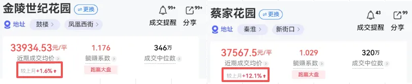 汇文双学区的金陵世纪花园,近期成交均价较上月上涨约1.6%;钟英加持的蔡家花园,近期成交价上涨约12%。