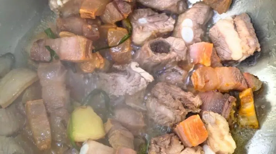 食材准备完成,下锅开煮。腊肉下锅炒香,加入开水炖煮烧开,加入已焯水的竹笋、豆腐百叶结、莴笋。耐心等待美味制作完成......