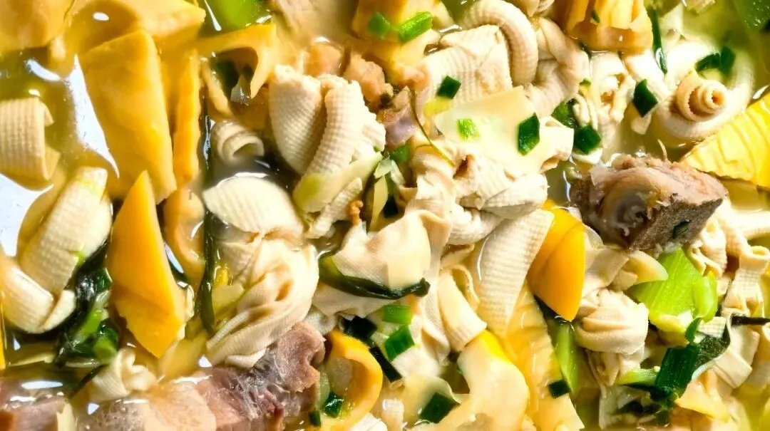 竹笋去掉外衣,再给排骨、腌肉、竹笋、莴笋“洗洗澡”,用流水冲干净。