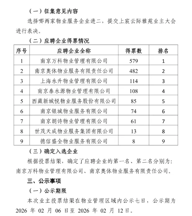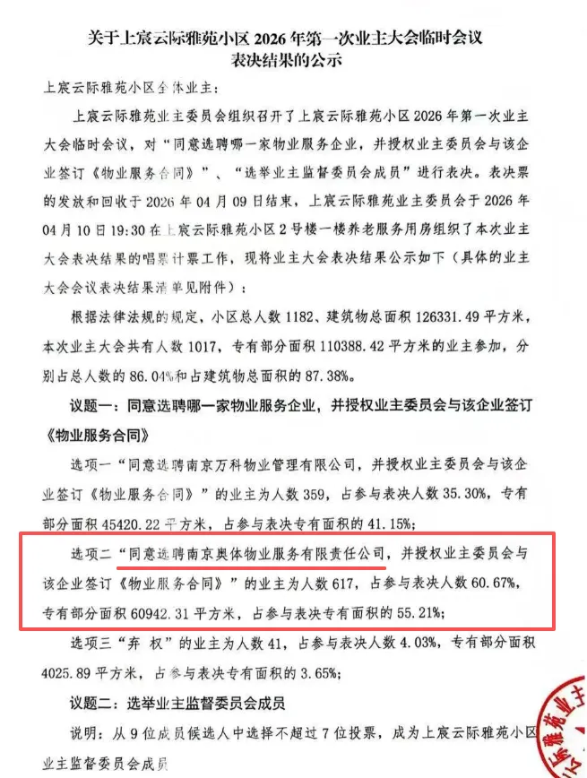 刚刚,上宸云际雅苑小区2026年第一次业主大会临时会议表决结果正式公示: