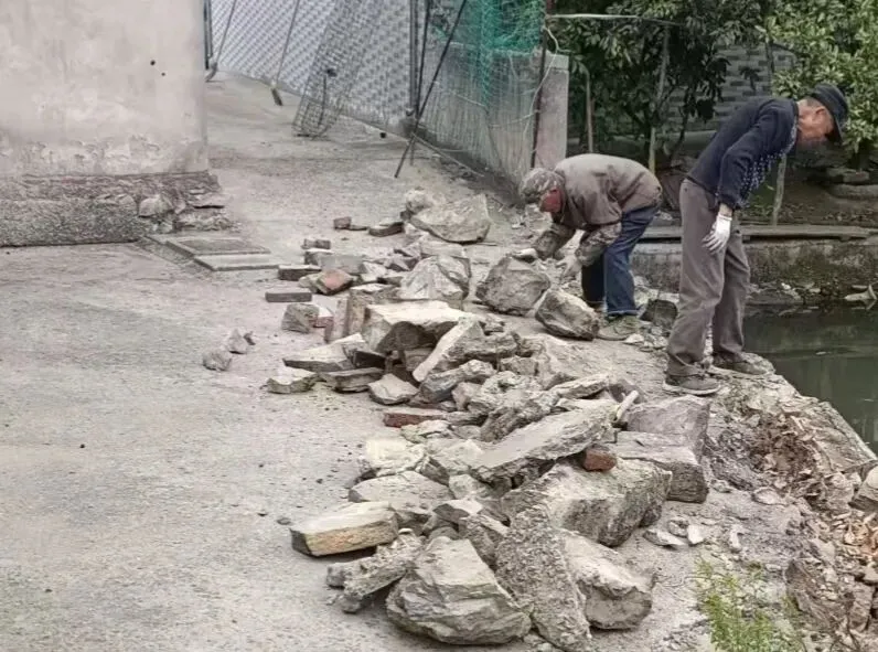 日前,秀山村刘家垅自然村一名村民在村级网格微信群内发布紧急求助信息,反映村内河塘沿岸一处路面出现大面积破损,路面边缘已然松动,随时有坍塌的风险,给过往行人、车辆通行带来极大安全隐患,急需处置。