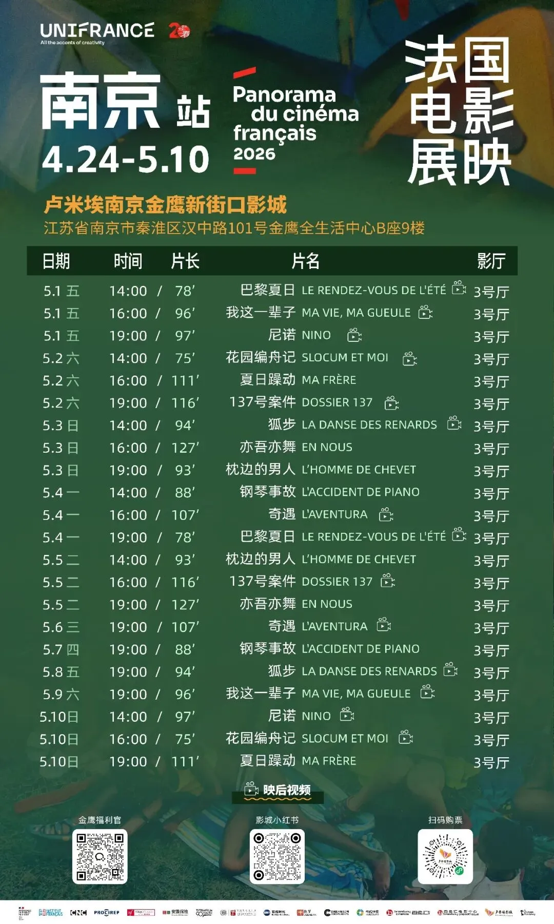 2026年法国电影展映·南京站将于4月24日至5月10日,在卢米埃南京金鹰河西影城、卢米埃南京金鹰新街口影城展映。今日公布本次展映的11部影片片单、排片表;南京站周边及兑换信息将陆续揭晓,敬请持续关注。2026年法国电影展映