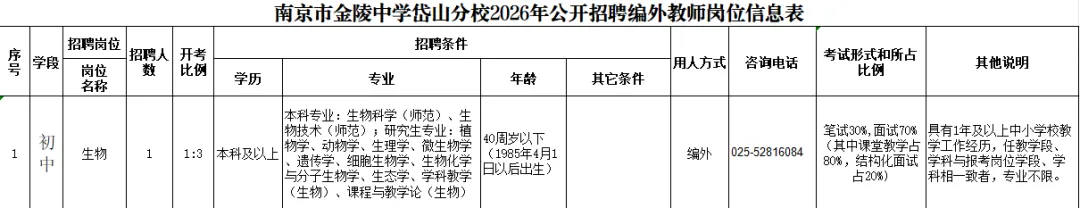 南京市金陵中学岱山分校2026年公开招聘编外教师公告