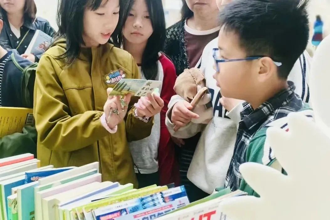 开市后,四(1)班的小主理人们迅速进入状态,热情地向来往的小伙伴介绍自家书籍的精彩内容,认真讲解置换规则。现场,孩子们手持闲置图书,主动分享自己的阅读感悟,在“一书换一书”的友好互动中,让一本本闲置图书找到新归宿。孩子们在自主交换中锻炼了沟通能力,更体会到分享阅读的快乐。