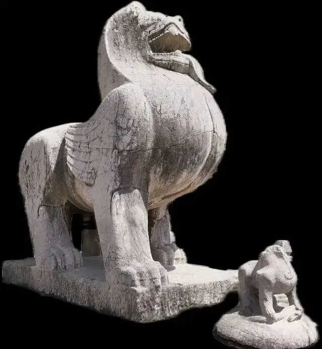这些石兽已经在这里站了一千五百年。风把它们吹得斑驳,在石面上蚀出孔洞,有的腿断了,有的角没了,但它们还是站着。那头辟邪昂首挺胸,张嘴似吼,翅膀上的纹路还依稀可辨。它是南朝梁代王侯墓前的神兽,本该守护死者的安宁,可墓早已不知去向,只剩它守着这片后来变成炼油厂的土地。