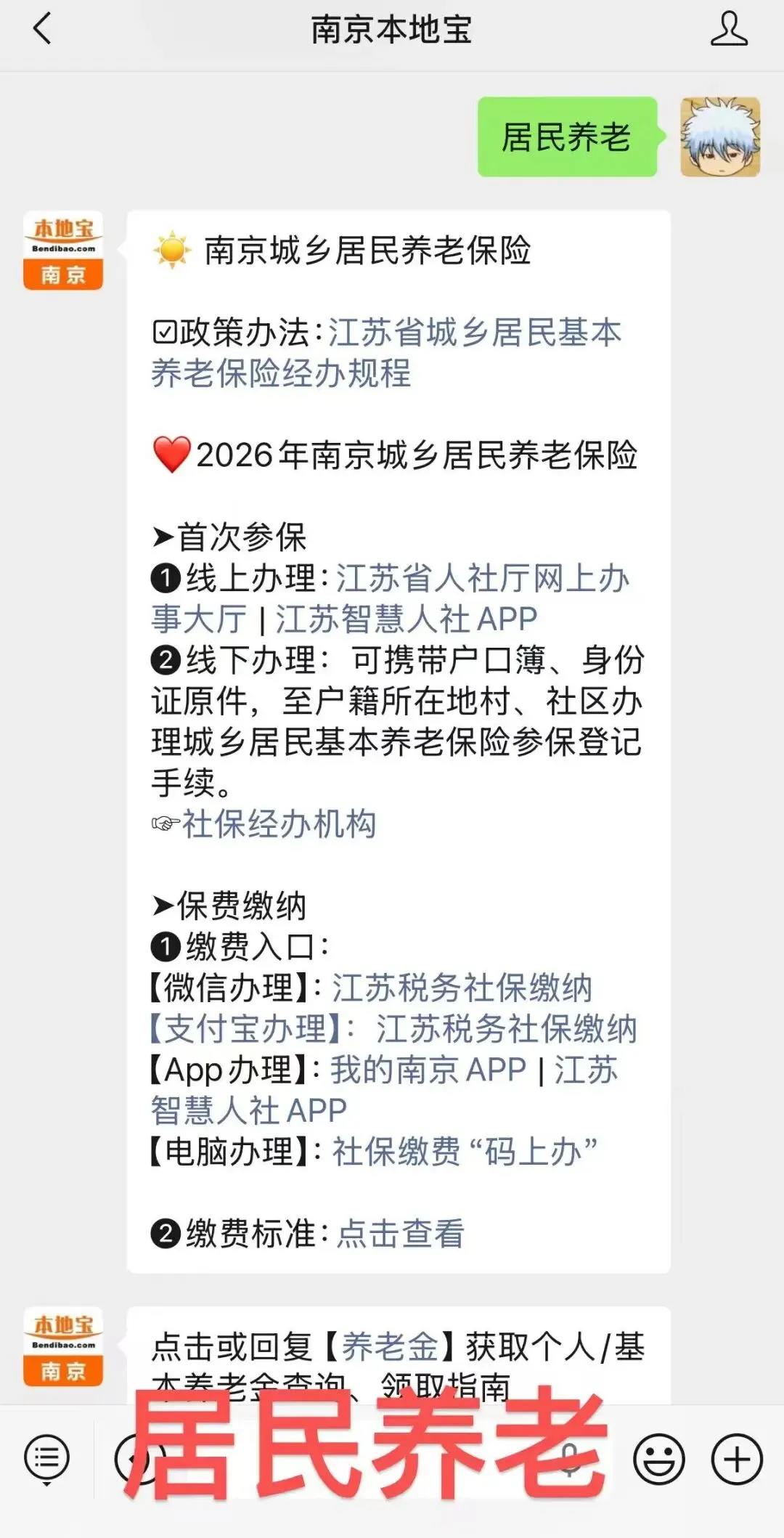 小编提醒:扫描下方二维码,关注南京本地宝,后台对话框回复【居民养老】,即可获取南京城乡居民养老保险缴费指南、线上缴费入口、养老待遇查询、常见问题解答。