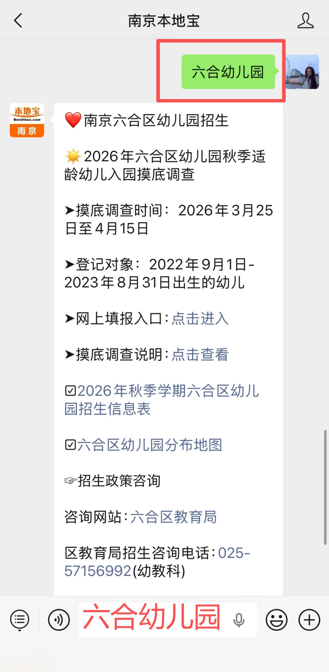 关注【南京本地宝】,后台对话框回复【六合幼儿园】即可获取六合区幼儿入园摸底调查填报入口、后续还有幼儿园最新招生消息等。