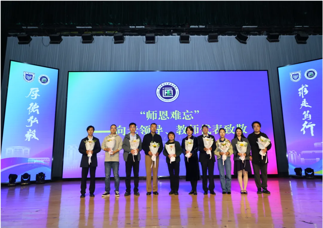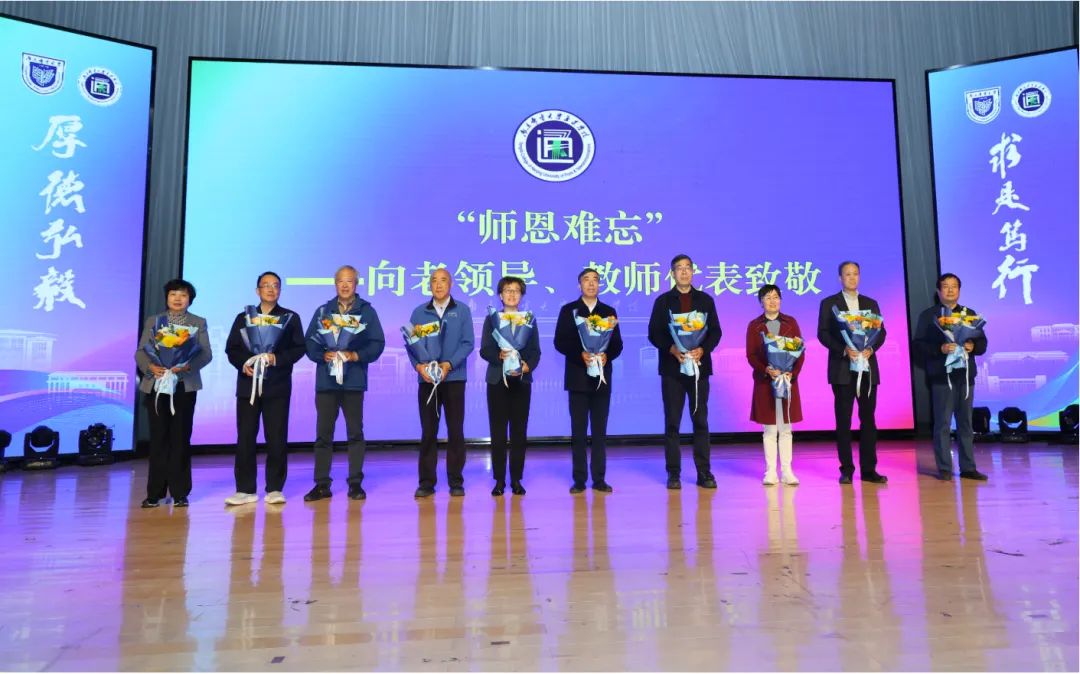 “师恩难忘”致敬环节中,学生代表向学院老领导、教师代表敬献鲜花,以质朴方式表达对恩师的诚挚感恩与美好祝福。