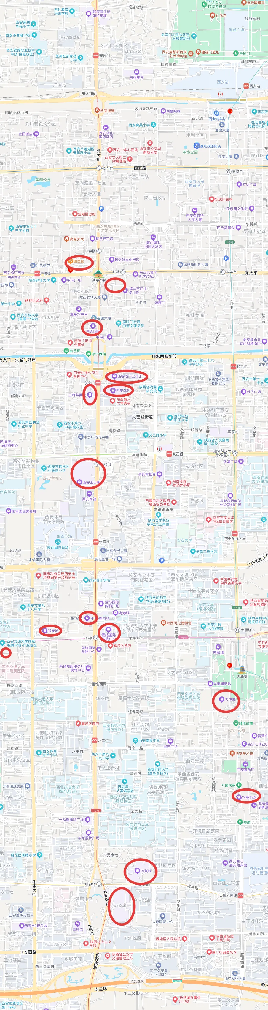 在西安,这条沿线有大明宫、碑林、钟楼、鼓楼、回民街、永宁门、小雁塔、陕历博、大雁塔、西交大、电视塔等。